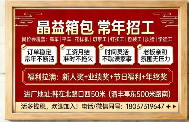 🔥晶益箱包新厂区 大量招人!全都要!可外放在家加工 厂长 1名|月薪 10000...