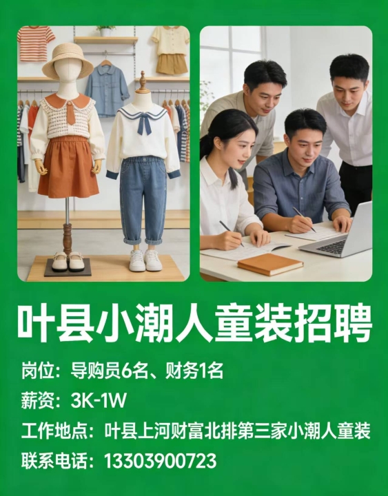叶县小潮人童装 新年招聘导购员 招聘岗位:导购员 6名 ...