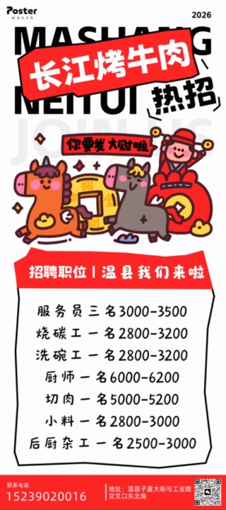 [庆祝][庆祝][庆祝]长江烤牛肉温县店开业在即现有以下职位招聘中:中餐厨师...