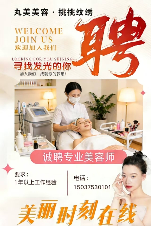 丸美科技美肤连锁 招聘以下岗位★ 美容师(若干):18-35岁,掌握基础美容...